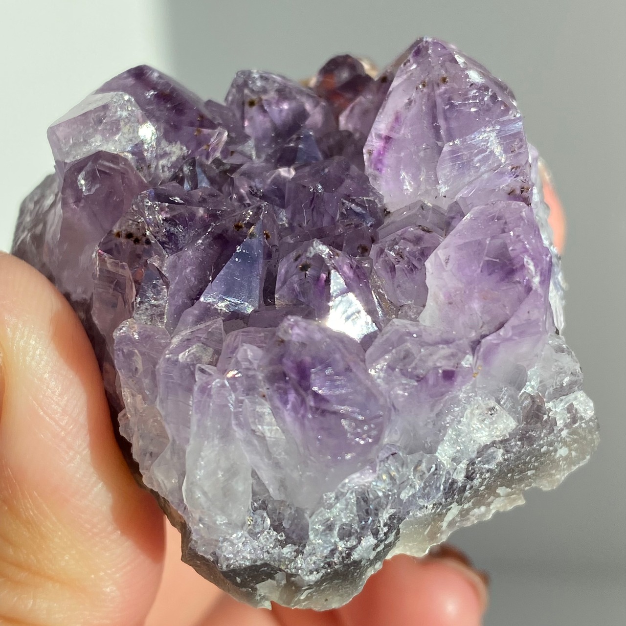 太陽の光を浴びるたびに、ひと粒ひと粒の結晶がきらりと輝き、深みのあるパープルが幻想的に浮かび上がるブラジル産アメジストクラスター。
